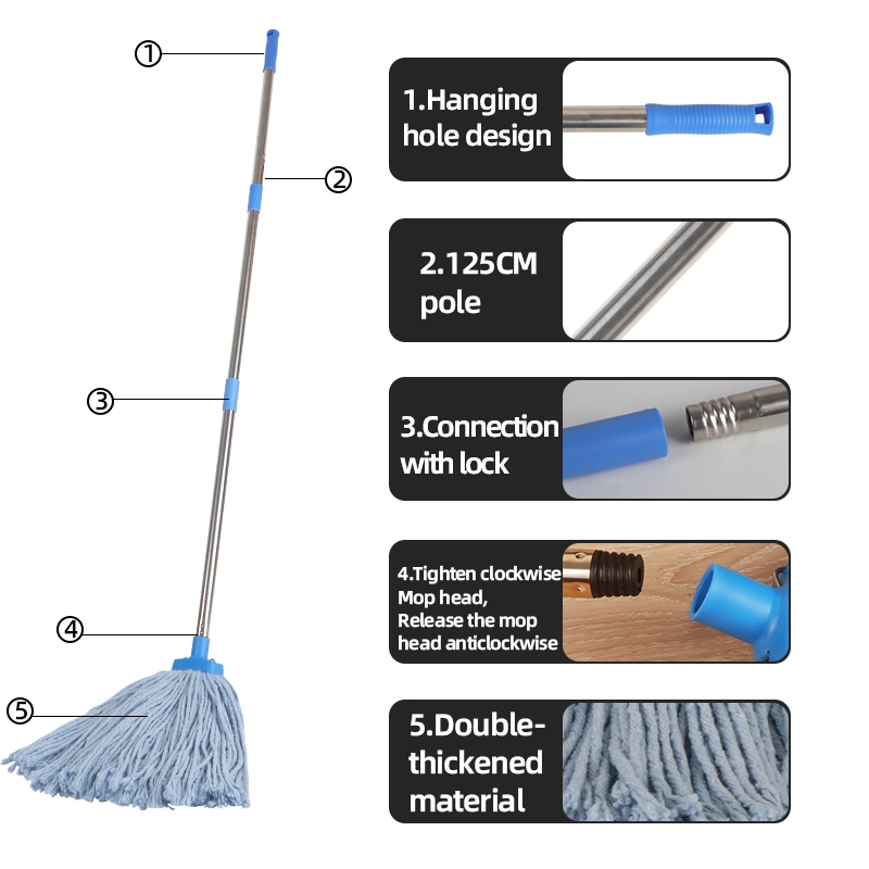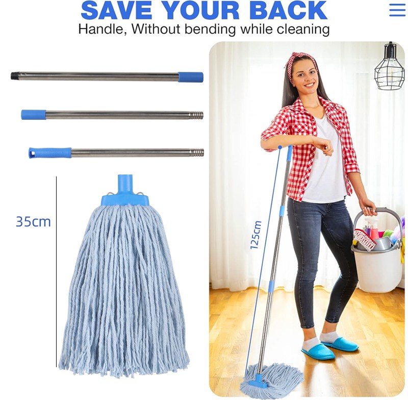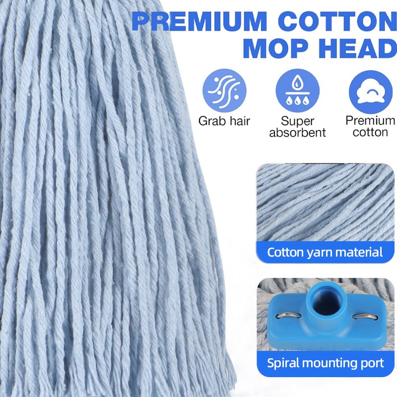 🔹Material del cabezal de la fregona: el cabezal de la fregona está hecho de algodón. Tienen una mayor absorción de agua y pueden absorber más de 7 veces su propio peso de agua. La cuerda suave no rayará la superficie del piso y puede limpiar y eliminar de manera rápida y efectiva los derrames, tanto húmedos como secos.